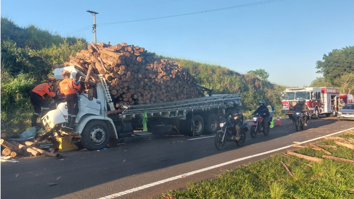 Equipes do Corpo de Bombeiros e do DER atuam no atendimento da ocorrência e na retirada dos veículos e da carga de madeira espalhada pela pista. A liberação total da rodovia ocorre de forma gradual, e motoristas que trafegam pela região devem redobrar a atenção.